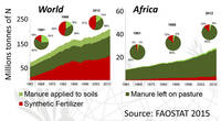 Manure plays an important role in sustaining agricultural production, particularly in extensive (low inputs) systems, where it provides a cheap, readily available resource that helps to replenish soil nutrients and maintain soil fertility. As shown in the graphs, in Africa in 2012 only 4% of the manure nitrogen was applied to soils, whereas 83% was left on pastures. Improving manure handling practices of overnight kraals and manure storage will increase the nitrogen availability for soil fertilization and subsequently enhance crop production and food security.